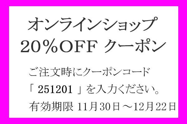 ご注文時、カート内のクーポンコード入力欄へクーポンコード「251201」を入力頂くと20%OFFになります。